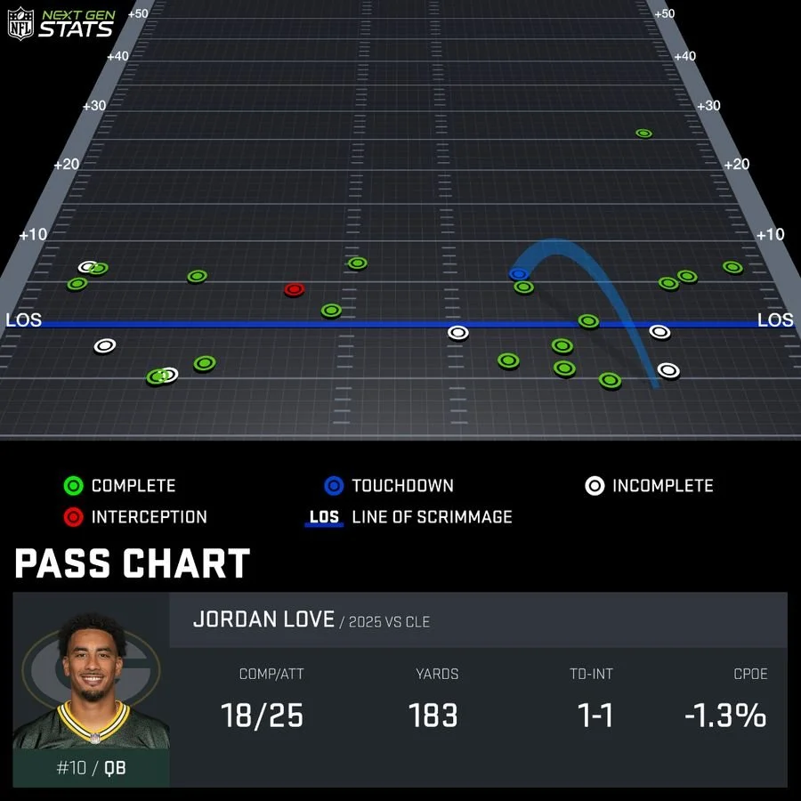 This is Love’s alter ego, and he shows up about five times per year. He posted the lowest air yards per attempt in the entire league (1.6), and he threw SO short that the next closest passer had DOUBLE the AY/A (Josh Allen at 3.2). And it wouldn’t be Evil Jordan Love without a colossally stupid interception, so….